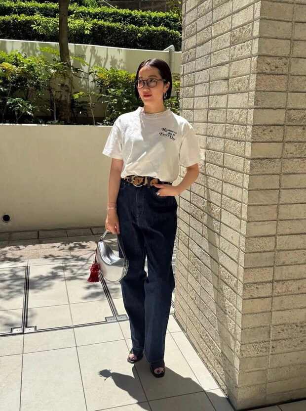いつものTシャツ×デニムスタイルがレオパード柄のベルトひとつで遊び心満点の着こなしに。