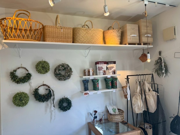 お店のドアを開けると、白を基調としたやさしい空間に、生活雑貨やアクセサリー、紙もの、かご、ドライフラワーリースなど、“シンプル&ナチュラル” なアイテムたちがずらりと並びます。