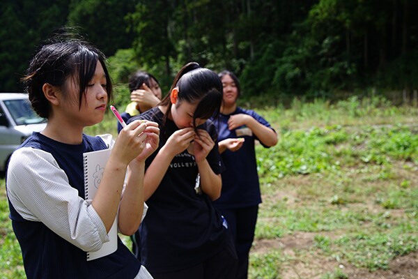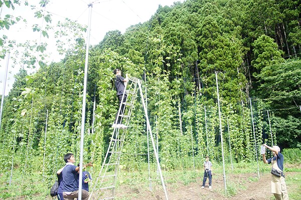 今年8月、石巻市立桜坂高校美術部員と若手社会人は、津波で甚大な被害があった石巻市北上町の農園を訪れ、ラベルデザインのヒントを探すため、石巻市北上町のホップ畑で収穫体験を行った。