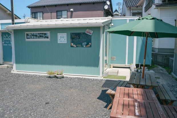 港町の風景に映えるパステルカラーのお店です。