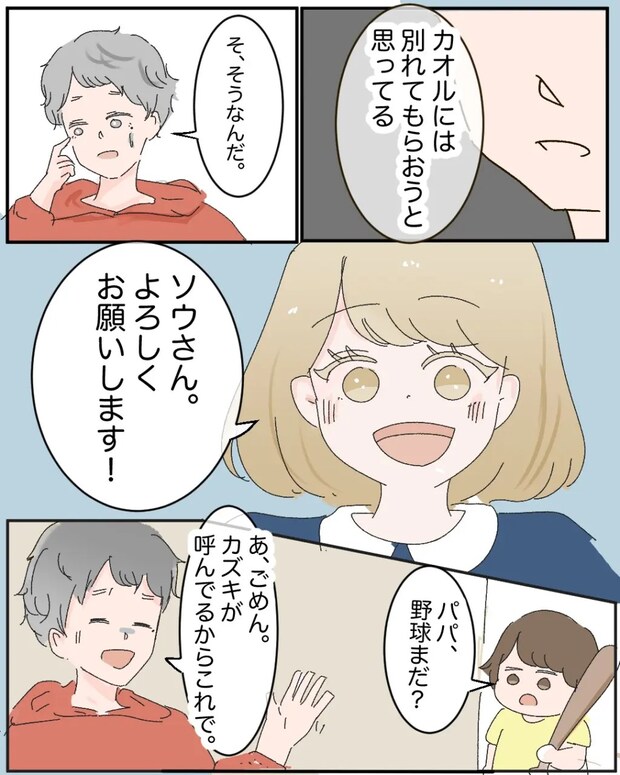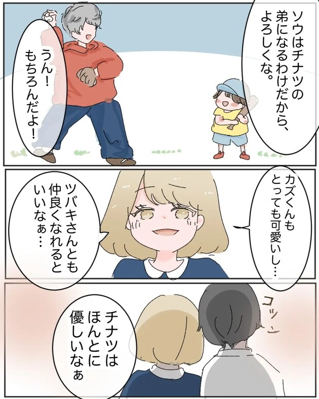 チナツさんが安定期に入ったので、妊娠の報告をしにツカサさんの実家へ向かった2人。ツカサさんの母親は突然の報告に驚いていたものの、よっぽど跡継ぎが大事なのか、文句を言いながらも結婚を許してくれました。3人で今後のことについて話していると、弟のソウさんが息子のカズキくんを連れて遊びに来ました。ソウさんにチナツさんを紹介すると、ソウさんは驚いた表情をしました。ツカサさんの横にカオルさんじゃない女性がいて、しかもお腹が大きいのだから、驚くのも無理はありません。ツカサさんが「カオルには別れてもらおうと思ってる」と伝えると、ソウさんは「そうなんだ」と気まずそうに言い、カズキくんのもとへ去っていきました。チナツさんは、ソウさんとカズキくんを見つめながら、「ソウさんはもちろん、カズくんやツバキさんとも仲良くなれるといいなぁ」と言いました。ツカサさんの実家とあまり関わりたがらなかったカオルさんと違い、チナツさんは友好的に接してくれる・・・ツカサさんは心の底から、チナツさんを選んでよかったと思いました。