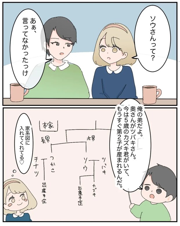 「ソウさんって?」聞きなれない名前に、チナツが問いかけます。「ソウは俺の弟だよ、奥さんのツバキさんと息子のカズキくんの3人家族で、もうすぐ第2子が産まれるんだ」と説明しました。
