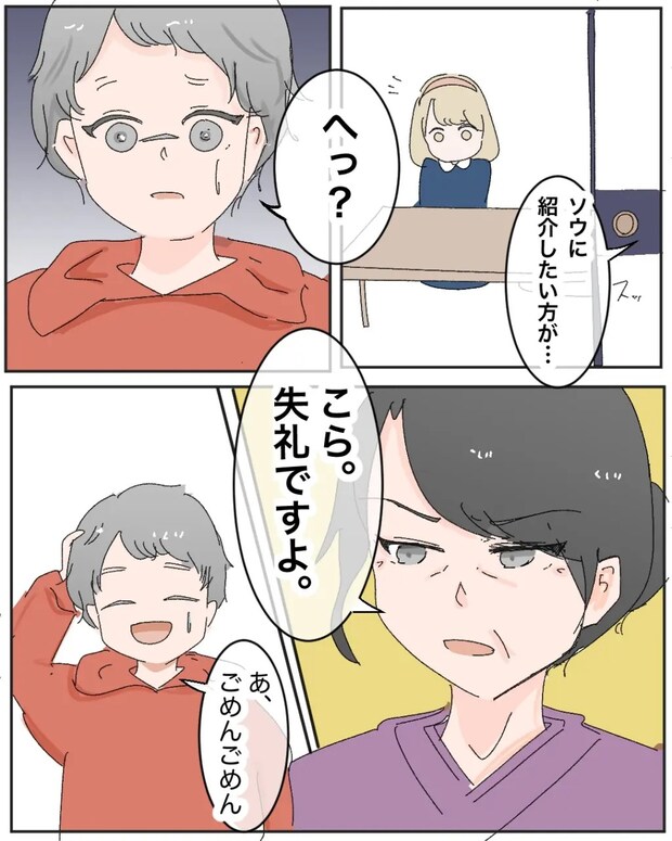 「ソウに紹介したい方が・・・」母が襖を開けると、ソウは驚いた表情でチナツを見ました。ソウはしばらく固まっていましたが「こら、失礼ですよ」という母の言葉にハッとしたのか、「あ、ごめんごめん」と笑いながら言いました。