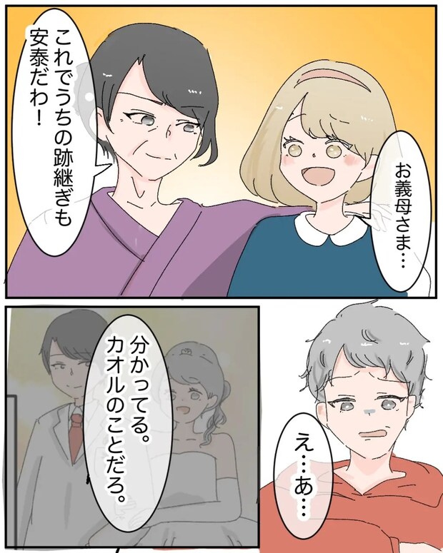「これでうちの跡継ぎも安泰だわ!」チナツの肩に手をまわし、嬉しそうに言う母。チナツも母に認められたことが嬉しかったのか、「お義母さま・・・」とうるうるとした瞳で言いました。ですが、ソウだけは「え・・・あ・・・」と事態をうまく飲み込めていない様子です。