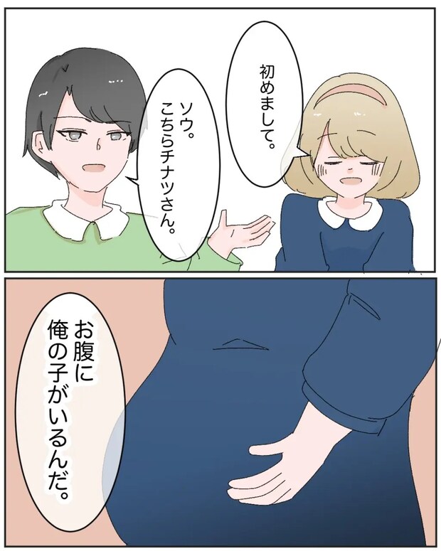 俺の横にカオルじゃない女性がいて、しかもお腹も大きくなっているんだから、驚くのも無理はありません。俺は「こちらチナツさん、お腹に俺の子がいるんだ」と、ソウにチナツを紹介しました。