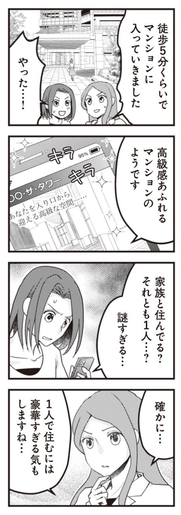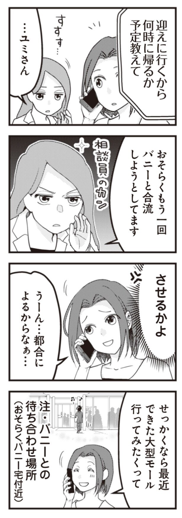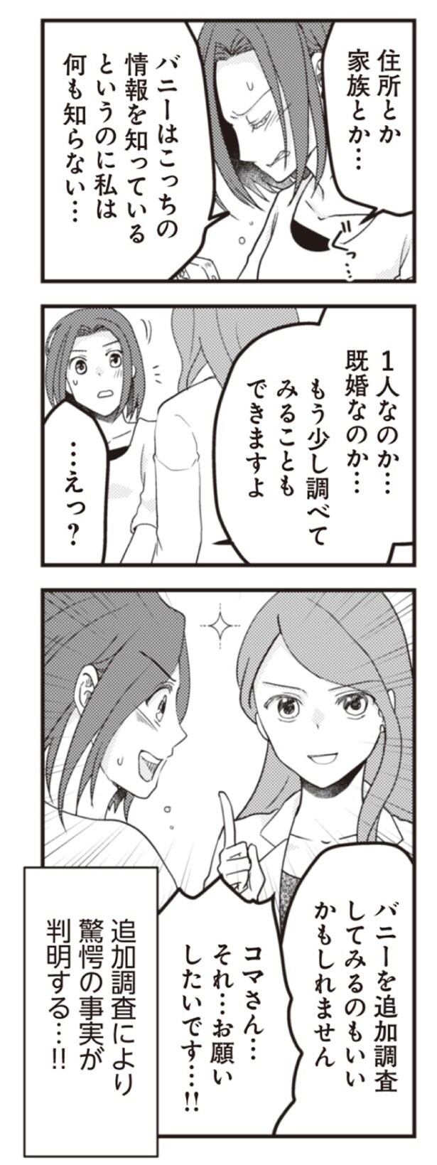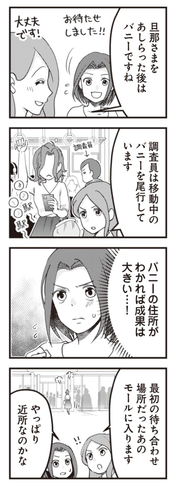 前回、ユミの電話のせいで夫と不倫相手は大喧嘩。不倫相手は怒ってその場を去ってしまった。その後、コマの調査は夫から不倫相手にターゲットを変更。果たして無事に不倫相手の住所まで特定することはできるのか…!?