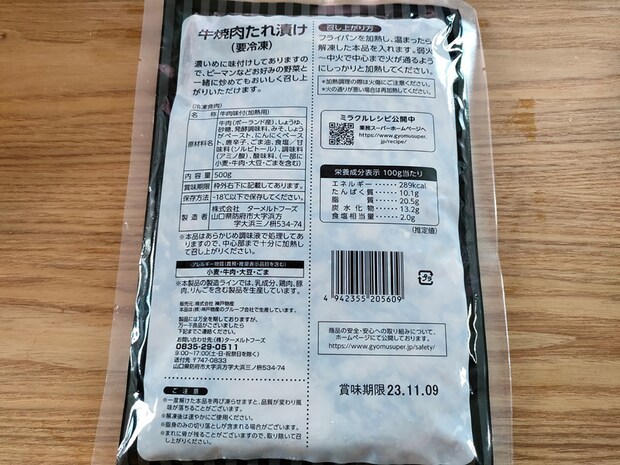 内容量は業務スーパーらしい500gの大容量で、約4人前。醤油、砂糖、味噌、しょうが、にんにくなどを使用したたれで味付けされています。