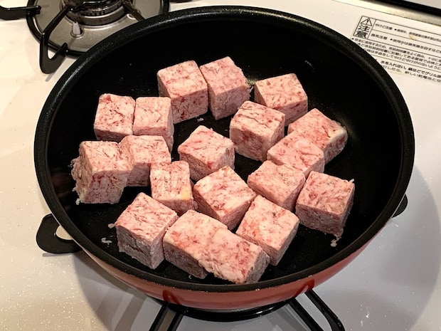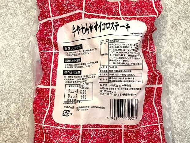 内容量は500gで価格は743円(税込)。袋から顔を覗かせる、均一にカットされたサイコロ状のステーキがなんとも美味しそうです!