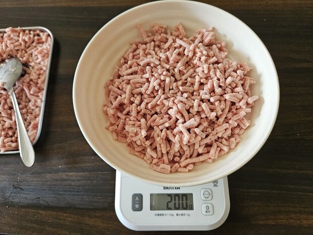 合い挽きミンチをトレイに出してみました。冷凍状態ですがお肉は固まっておらず、バラバラの状態。
