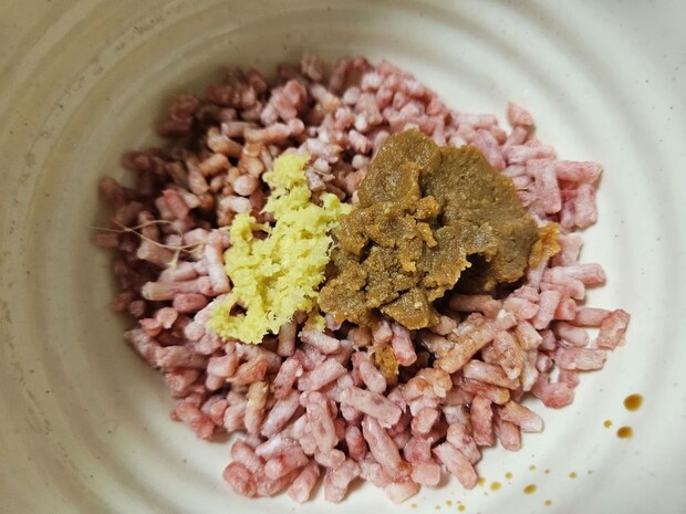 もう一品、牛豚合挽ミンチを使用し、レンジで完結するそぼろ肉を作ってみます。合い挽きミンチに醤油、味噌、生姜すりおろし、砂糖、酒を分量分加えて混ぜ、レンジで加熱していきます。