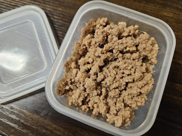 出来上がったそぼろ肉がこちら。タッパーに詰めて冷蔵庫で保存しておけば、いつでもご飯のふりかけやおにぎりの具材などに活用できて便利ですよ!