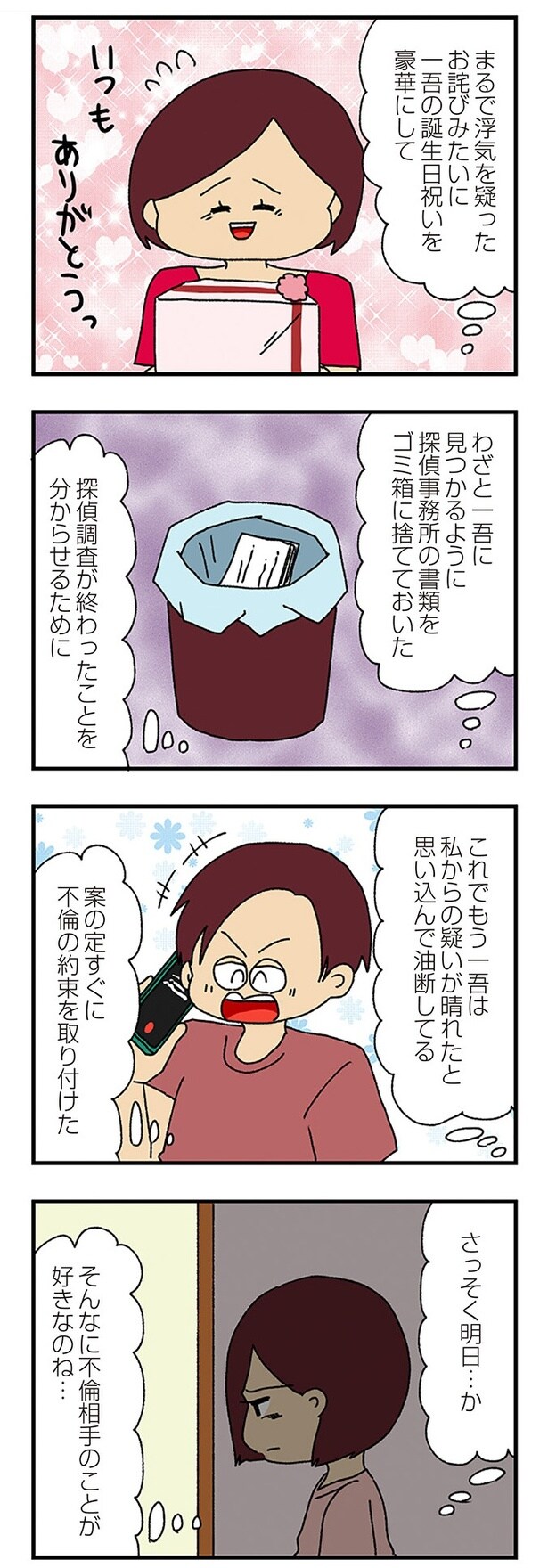 前回、探偵事務所で1ヵ月尾行したものの、結果はシロだったと聞かされたなつめ。しかも、探偵を雇ったことが一吾には最初からバレていた。続いてなつめがとった行動とは…!?