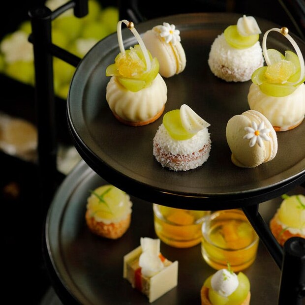 スタンドの上段では、ライチのムースに丸の内ハニーのレモンマーマレードが添えられた1品や、ミントが香るマカロン、シャインマスカットをあしらったココナッツフィナンシェなど、香りと甘みのバランスが絶妙なスイーツがトレーを彩る。