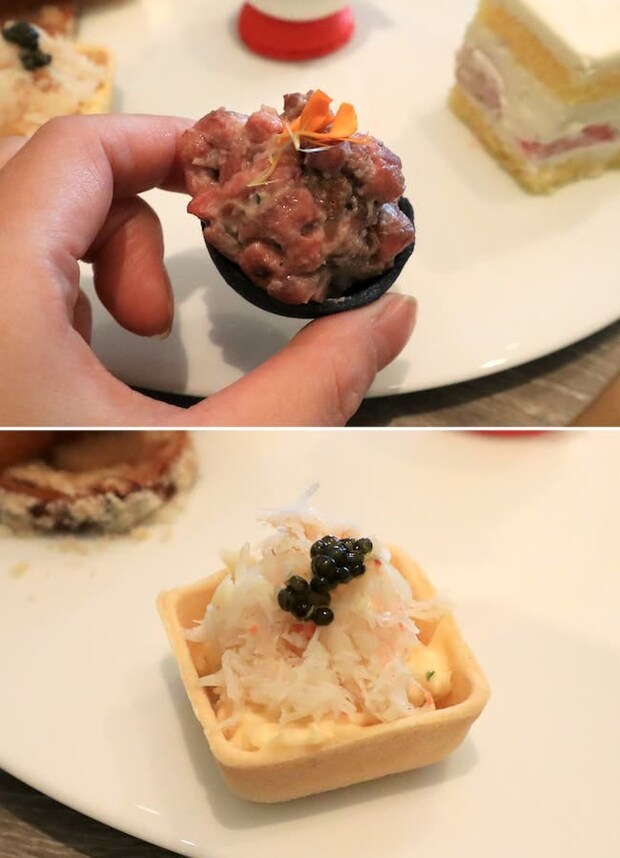 厳選した食材を使用したセイボリーのなかでも、編集部が気に入ったのは「和牛タルタル」。やわらかなお肉にタルタルソースを和え、西洋ワサビのクリームが添えたタルト仕立てです。ひと口サイズですが、いただくと肉肉しさがダイレクトに感じられ満足感があります。タルタルがコクをプラスしているのも、おいしさのポイント。