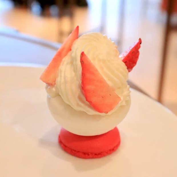 「ストロベリーモンブラン」は、見た目のかわいらしさに心奪われたスイーツのひとつ。白×赤の彩りと洗練されたフォルムが素敵で、唯一無二の存在感があります。サクサクのフレンチメレンゲを器のように使っており、そこにホクホクとした栗のクリームやなめらかなホイップクリームをオン。さらにいちごをあしらっており、次々と変わる食感や味わいが楽しい!