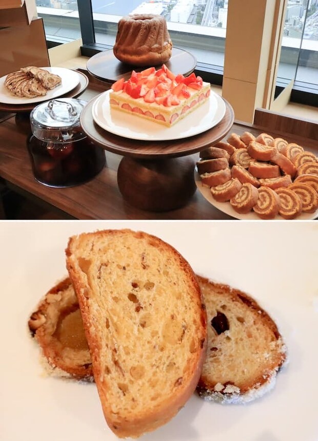 スタンドのスイーツ&セイボリーのほかに、好きなだけいただけるトロリーサービスがあるのもこちらの魅力。「洋ナシの赤ワイン煮」や「ストロベリーショートケーキ」など、トロリーサービスもクリスマスらしいラインナップで、今回は「シュトーレン」と「クグロフ」を試食しました。