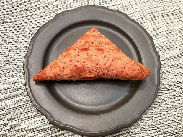 お皿に取り出してみた写真がこちらです。ピンク色に焼き上げられた三角チョコパイで、スイーツらしい甘い雰囲気を演出!