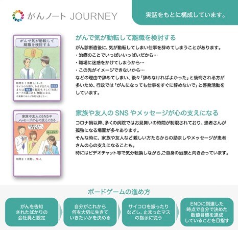 「がんノートJOURNEY」は、がんを経験していない人が、がん患者としての人生を“追体験”できる人生ゲーム形式のボードゲーム。プレイヤーは診断、治療、仕事、家族関係などに関する選択を行いながら、がん患者が直面する現実を模擬体験する。