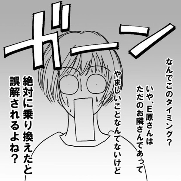 E原さんが部屋にいるタイミングでM性が来たたことに焦るS葉さん。このままだと「ただのお隣さん」であるE原さんとの関係に誤解が生じるかもと思っています。