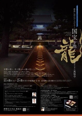 11月8日(土)〜2026年2月8日(日)の期間の毎週金・土・日、京都宇治市にある「黄檗宗大本山 萬福寺」で、特別拝観&光のアートインスタレーション「漆黒に浮かび上がる――国宝を抱く龍」が開催される。