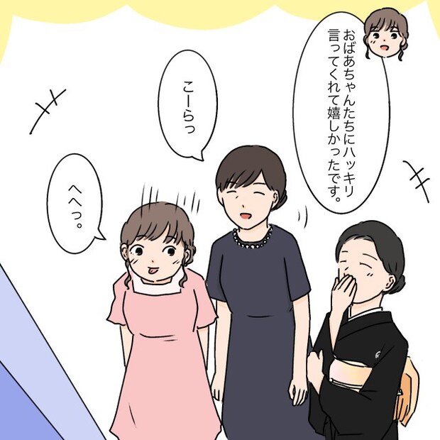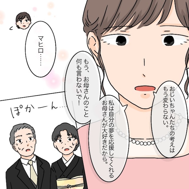 「おじいちゃんたちの考えはもう変わらない。私は自分の夢を応援してくれるお母さんが大好きだから。もう、お母さんのこと何も言わないで!」マヒロの言葉に思わず「マヒロ・・」と呟く私。義父母は二人してぽかーんとしていました。