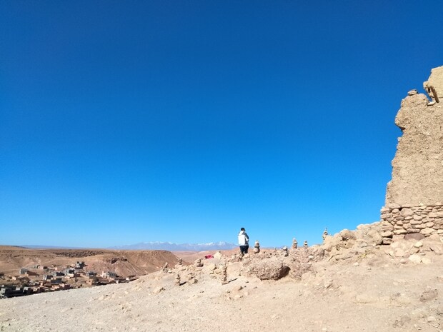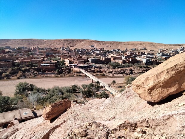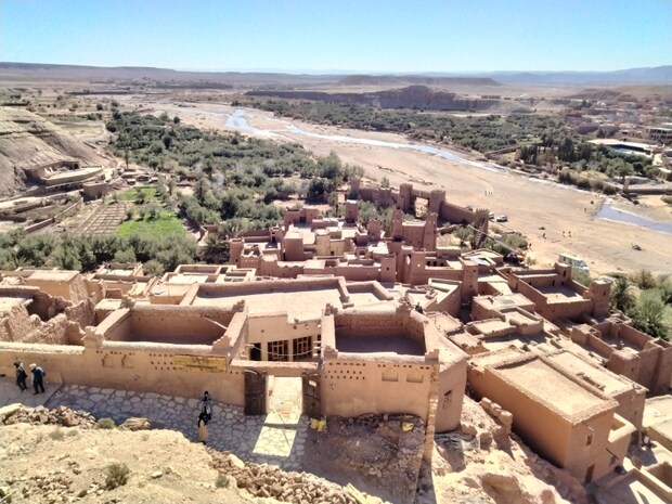 赤茶色の建物群が川沿いに広がり、アトラス山脈を背景に広がる風景はまさに映画の一場面のようです。サハラ砂漠や周囲のオアシスも一望できます。