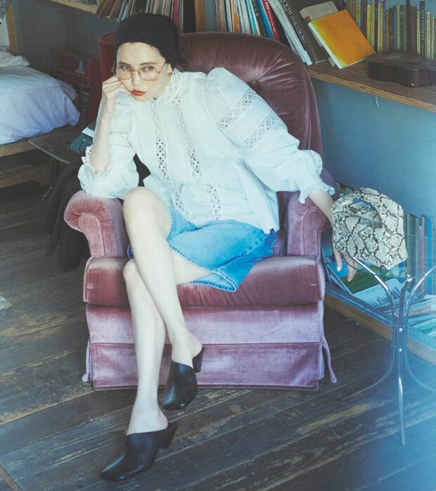 ピュアな白ブラウスとボーイッシュなハーフデニムの、大人にとっては少々チャレンジングな組み合わせ。デザイン性のあるメガネ&ミュールなど、カッチリしたアイテムをプラスするのが、子どもっぽくならない秘訣です。