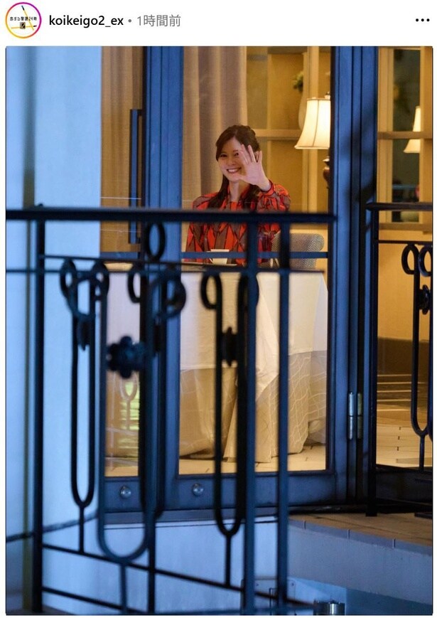 この日、公式Instagramは「里夏役の白石さんが、気付いて手を振ってくれました」のコメントとともに、写真を投稿。赤いワンピースを着た白石が、窓の向こうからカメラに気付きこちらに手を振るオフショットを公開した。