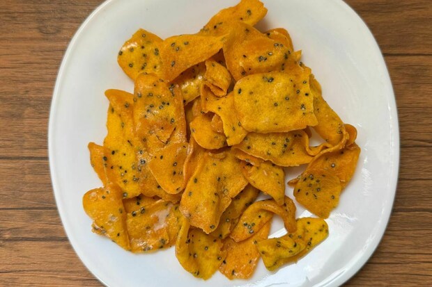 宮崎県で収穫された新芋を薄い輪切りにし、カリッと揚げて仕上げています。袋を開けると、さつまいもの甘い香りが食欲をそそります。