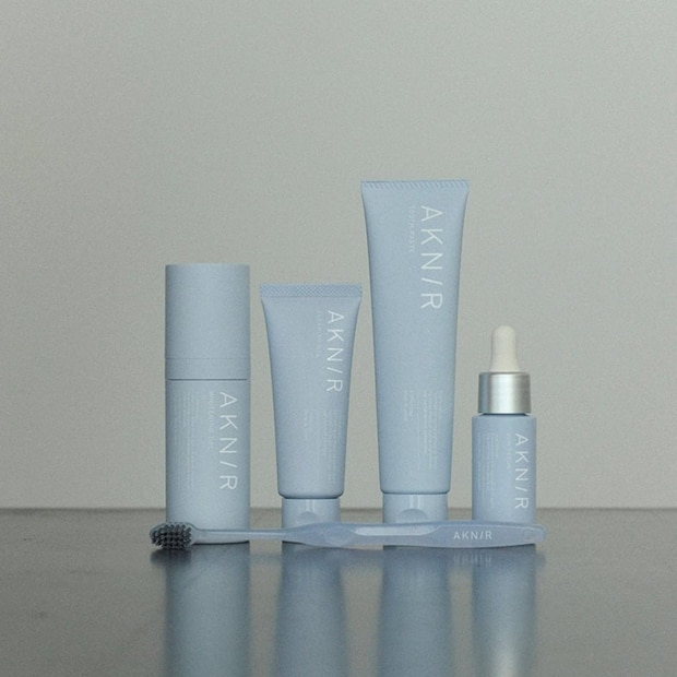 左から時計回り:朝の歯磨き後に使う、色補整技術で白い歯に導く3種のアパタイト配合ジェル。天然由来成分99%で、パラベンや鉱物油、合成香料不使用の優しい処方。アクニースペシャルカラージェル 30g ¥4,400、舌のクリーニングに使用するジェル。口腔内のフローラを整えて口臭やドライマウスの予防に。同 クリーニングジェル 45g ¥2,640、歯磨き時に使う薬用ホワイトニング歯磨きペースト。口内環境を清潔に保ち、歯周炎を予防する成分もしっかり。同 デンタルペースト 100g ¥2,970。歯茎専用の純度100%のごま油を採用したマッサージオイル。唾液の分泌を促して、虫歯や歯周病、口臭といった口内トラブルの予防に最適。同 オーラルセラム 17mL ¥4,400、炭配合の特別抗菌された超極細毛の歯ブラシ。同 トゥースブラシ ¥550(全てAKNIR)