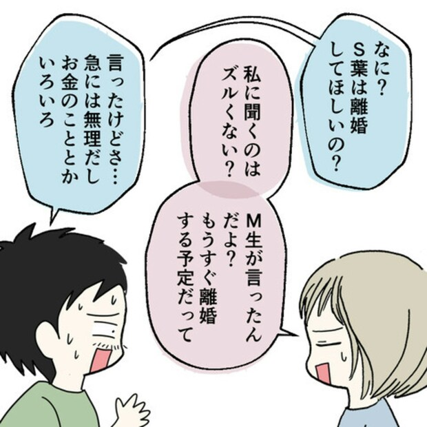 M生はS葉さんと付き合い始めたころからずっと「離婚する」と言っていたのに、今も離婚していないM生に怒りが込み上げてきます。