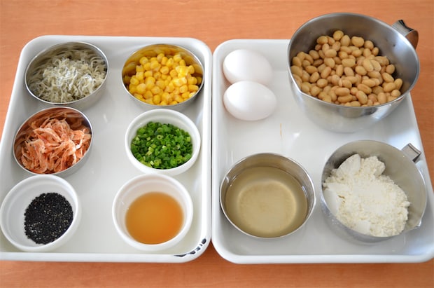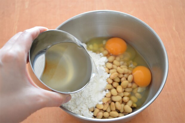 1. 大豆に小麦粉、卵、だし汁を加え混ぜたら、ちりめんじゃこ、コーン、桜えび、青ねぎ、黒いりゴマを加え軽く混ぜ合わせる。