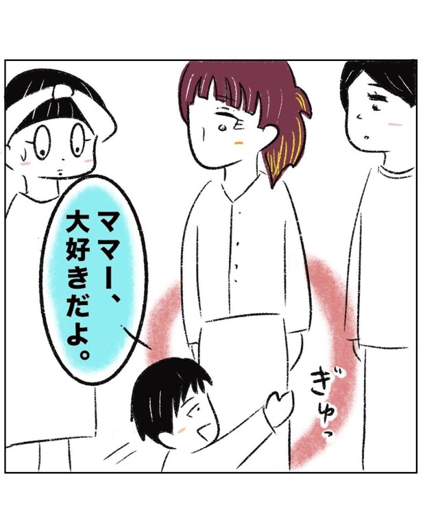 ママから「いい子」と言われたつーくんは、さっとママに駆け寄ると「ママー、大好きだよ」と言いながらぎゅっと抱きつきました。