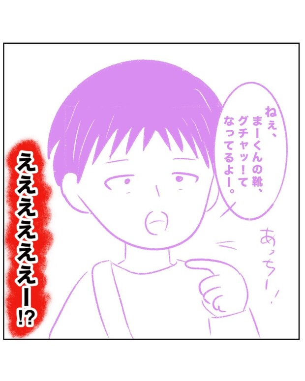 自分が踏みつけてぐちゃぐちゃにしたまーくんの靴を指差して素知らぬ顔で「まーくんの靴、グチャってなってるよ」とママたちに教えるつーくんを見て、まるさんは「ええええええー!?」と驚愕。