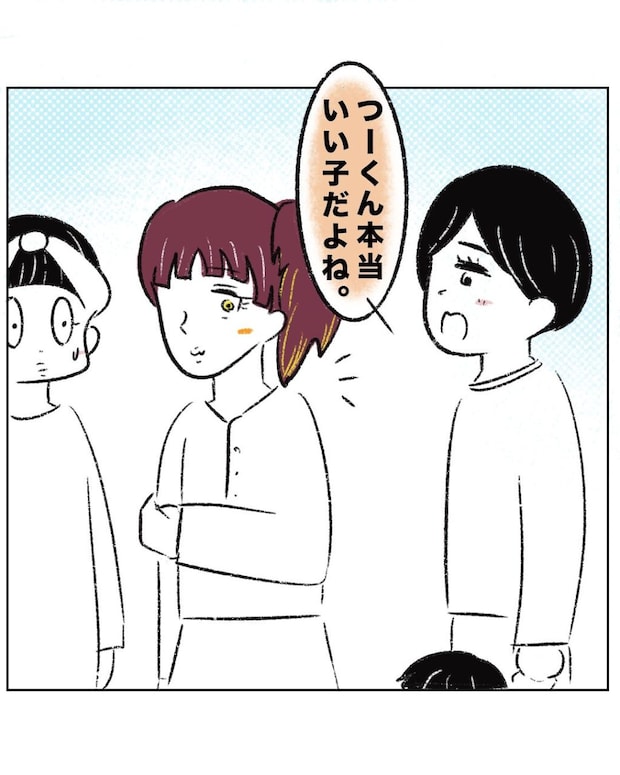 自分が踏みつけてぐちゃぐちゃにしたまーくんの靴を「ぐちゃぐちゃになってるよ」とママたちに教えて「ぼく、直してあげる」ときれいに整えてあげたつーくん。何も知らないまーくんママが「つーくん優しいね。ありがとう」と言うと、つーくんは「ううん!友達だもん!」と満面の笑みで答えました。ママたちに「いい子」と褒められると、つーくんはママに駆け寄って「ママー、大好きだよ」と言いながらぎゅっと抱きつきました。つーくんの裏の顔を見てしまったまるさんは、大人の前でいい子、かわいい子を演じるつーくんにドン引きです。