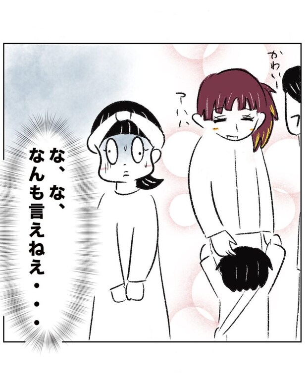 そんなつーくんを見て、つーくんママも周りのママも「かわいいー」と和やかな空気に包まれていましたが、まーくんの靴を踏みつけるつーくんを見ていたまるさんはつーくんの表の顔と裏の顔のあまりの違いに「な、な、なんも言えねぇ・・」と言葉が出ませんでした。