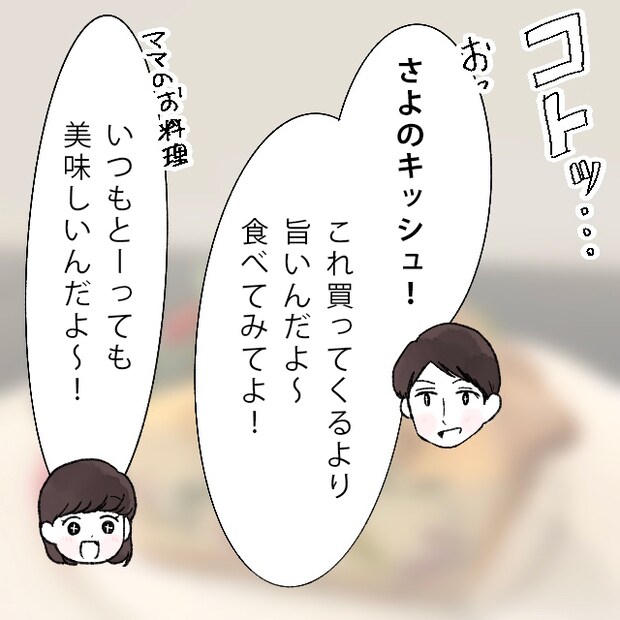 「おっ、小夜のキッシュ!これ買ってくるより旨いんだよ~!食べてみてよ!」と勧める夫と、「ママのお料理、いつもとーっても美味しいんだよ~!」と目をキラキラさせて言うのの。