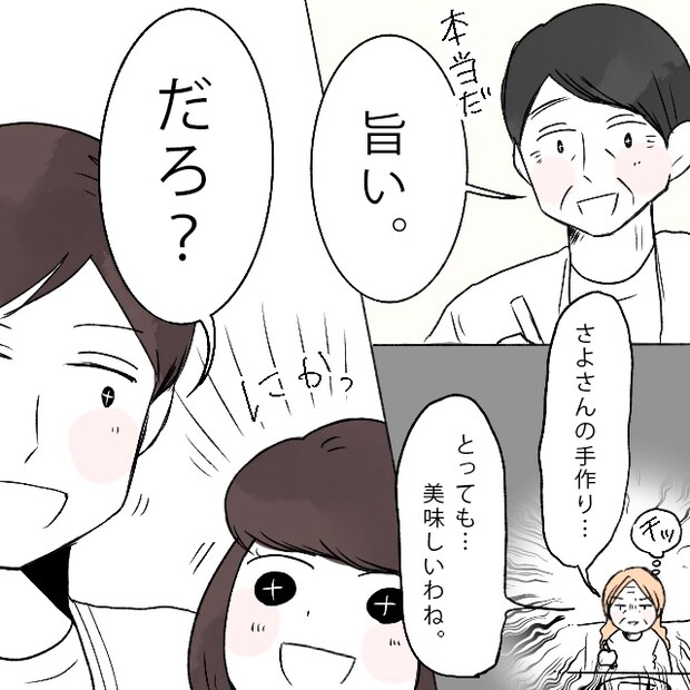 早速一口食べた義父が「本当だ。旨い」と言うと、「小夜さんの手作り・・とっても・・美味しいわ」と不満そうに褒める義母には構わず、「だろ?」と満足そうに笑うののと夫。
