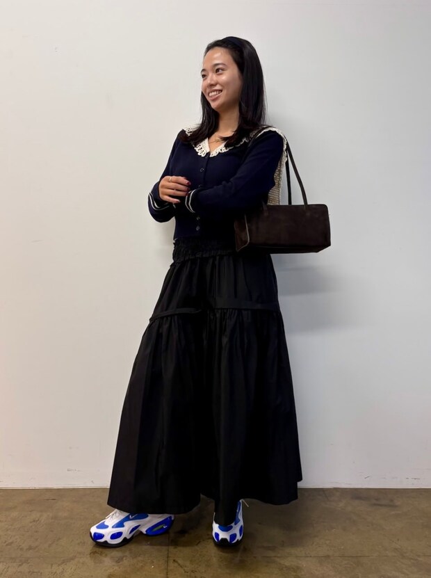 「大きなレースカラーが施されたカーディガンとボリュームのあるロングスカートで、メリハリのあるシルエットに。足元にはあえて存在感のあるシューズを合わせることで、フェミニンなトップスをほどよくカジュアルダウンしました」