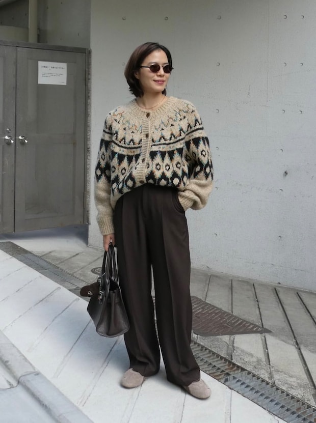 「今季トレンドのブラウンで統一し、秋らしい印象のコーディネートに仕上げました。毛足の長いトープスエードのPUMAのスニーカーや柄ニットで、シンプルだけど遊び心をミックスさせたのがポイントです」