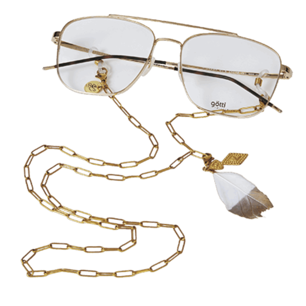 スイスのアイウェアブランド。眼鏡¥58,000(ゴッティ)、羽根がワンポイントに。眼鏡に付けたグラスコード¥11,220(サニーコーズ)