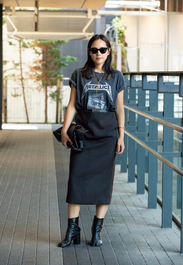 「レディな印象のタイトスカートは、タフなTシャツで甘くならないように意識。レザーの小物を合わせて秋らしさも散りばめました」