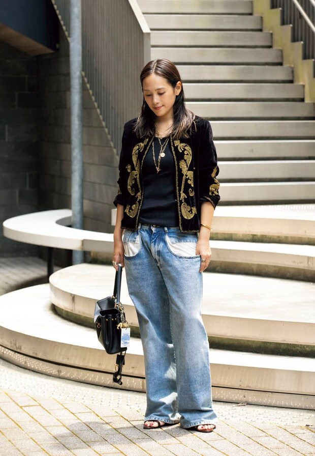 「ゴールドのコード刺繍とベルベットのコンビがオリエンタルな雰囲気のジャケットにモードなデニムを合わせて、どこかヴィンテージムードを感じるスタイリングに仕上げました」