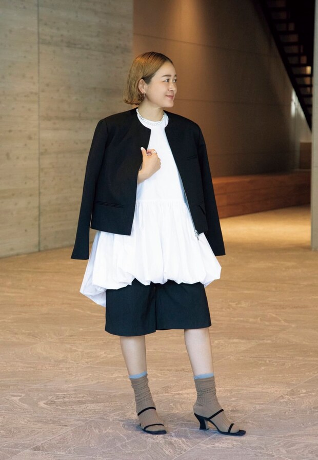「ジャケットもブラウス同様、コルデラ。ブラウスの甘さと対照的に、短丈のデザインがモダンで気に入っています。さらにボトムにはショートパンツを合わせて少しメンズライクなムードに。少年っぽくならないようにヒールでバランスを意識しました。ソックスは洋服のム—ドに合わせて2色をレイヤードし表情をプラス」