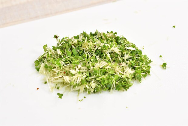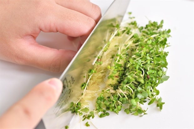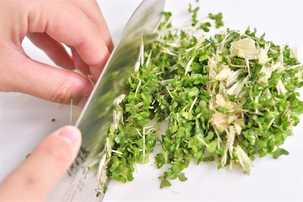 包丁やハサミを使って、茎や葉の部分をできるだけ細かく刻みます。こうすることで、細胞が壊れ、グルコラファニンとミロシナーゼが混ざり合います。
