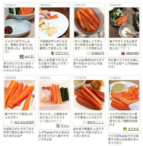 こちらのレシピに届いているつくれぽ(みんなの作りましたフォトレポートのこと)には、「食べやすくて夫と息子がたくさん食べてくれました」「これだけの工程でとってもおいしくなりますね」と、喜びの声がたくさん。「ホントに、人参くささがなくなっててビックリ」という声も!