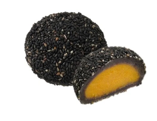 揚げずに焼き上げたもちもちの生地で北海道産のかぼちゃあんを包み、黒ごまをまぶして仕上げた胡麻団子。香ばしい胡麻の食感と一緒に、生地のもちもち感が特徴です。なかのかぼちゃあんもやさしい甘みで、全体のバランスが絶妙な胡麻団子ですよ。