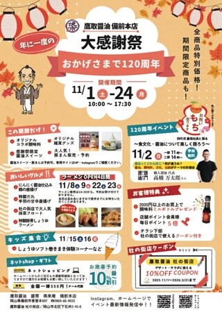 岡山県備前市の鷹取醤油が、11月1日(土)~24日(月)の期間、毎年恒例の大感謝祭を開催!今年は「創業120周年感謝祭」と銘打ち、節目への想いを込め、限定商品の販売や自社調味料を使った美味しいグルメ販売の他、食文化に関するトークセッションなども行われる。