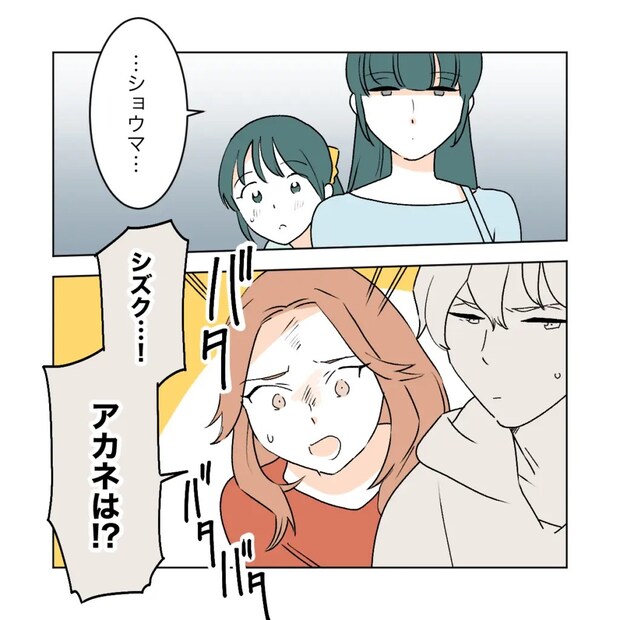 大人たちが必死で走ってきて、ママは無表情で立ち去ろうとして、状況がよく分からず動揺するミズキ。そこへカエデがようやく追いつきました。「シズク・・・!アカネは!?」とひどく動揺しています。