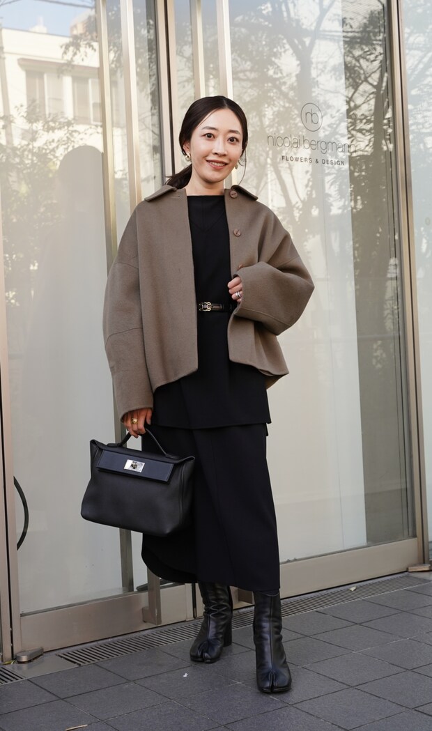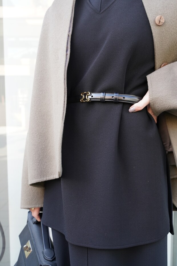 「ドレスの上に同素材のVネックトップスをレイヤリングしています。ベルトでブラウジングすることで目線を上げてスタイルアップ効果も。全体をシックで上品なムードにまとめつつ、アウターでブラウン、アクセサリーでゴールドを差すことで重すぎないバランスを意識しました」